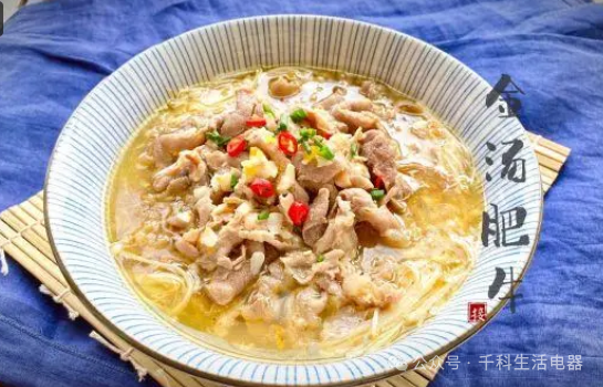 將準備好的金湯倒入鍋中煮沸。加入牛肉片,加少許鹽和雞精調(diào)味。