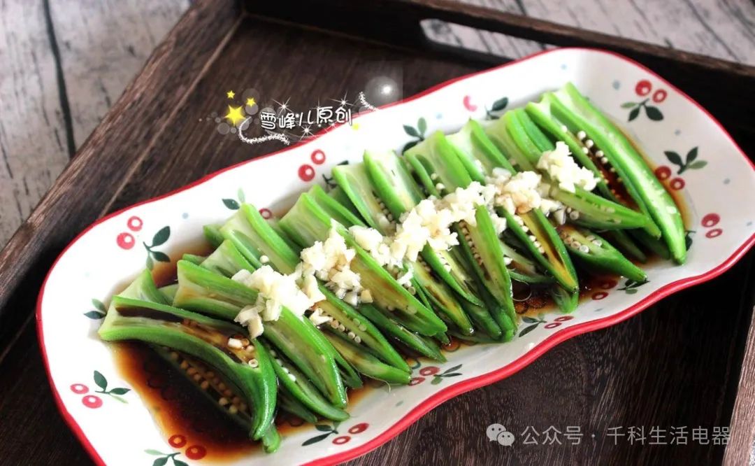 1、秋葵洗凈,對半切開,用開水焯一下,立即放入涼水中冷卻,盛入盤中。