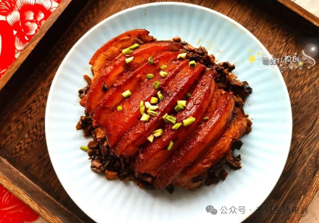 4、取一個碗,把五花肉皮鋪在碗底,上面放上炸好的梅干,上面淋上一些腌好的肉醬,蒸2小時左右,取出倒扣的時候準備好,在上面撒上切碎的青蒜或小蔥作為裝飾。