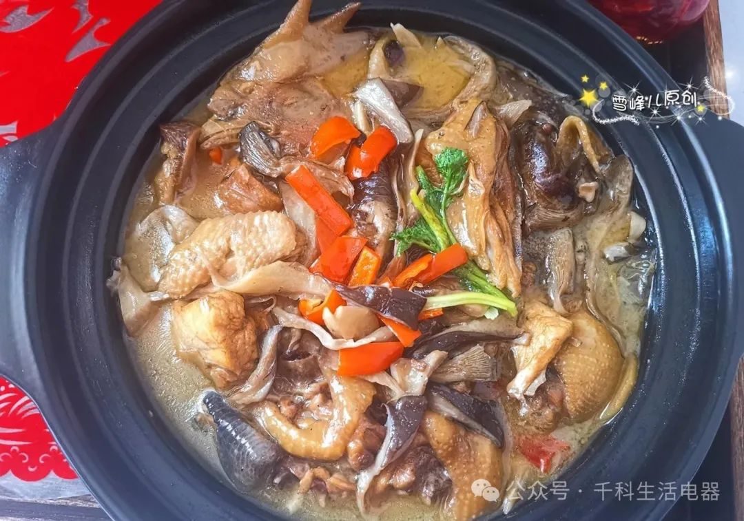 3.燉約30分鐘,加入干香菇和香菇繼續(xù)燉約20分鐘,加鹽調(diào)味。